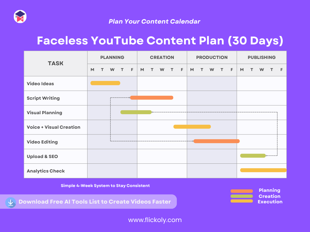 Consistency is the secret ingredient on YouTube. Plan at least 8–12 video topics before you start publishing. You can take inspiration from trending faceless YouTube channel ideas and adapt them to your niche. Group them into a content calendar — for example, 2 videos per week for the first month. Beginners who plan ahead are 3x more likely to stay consistent past the first 30 days.